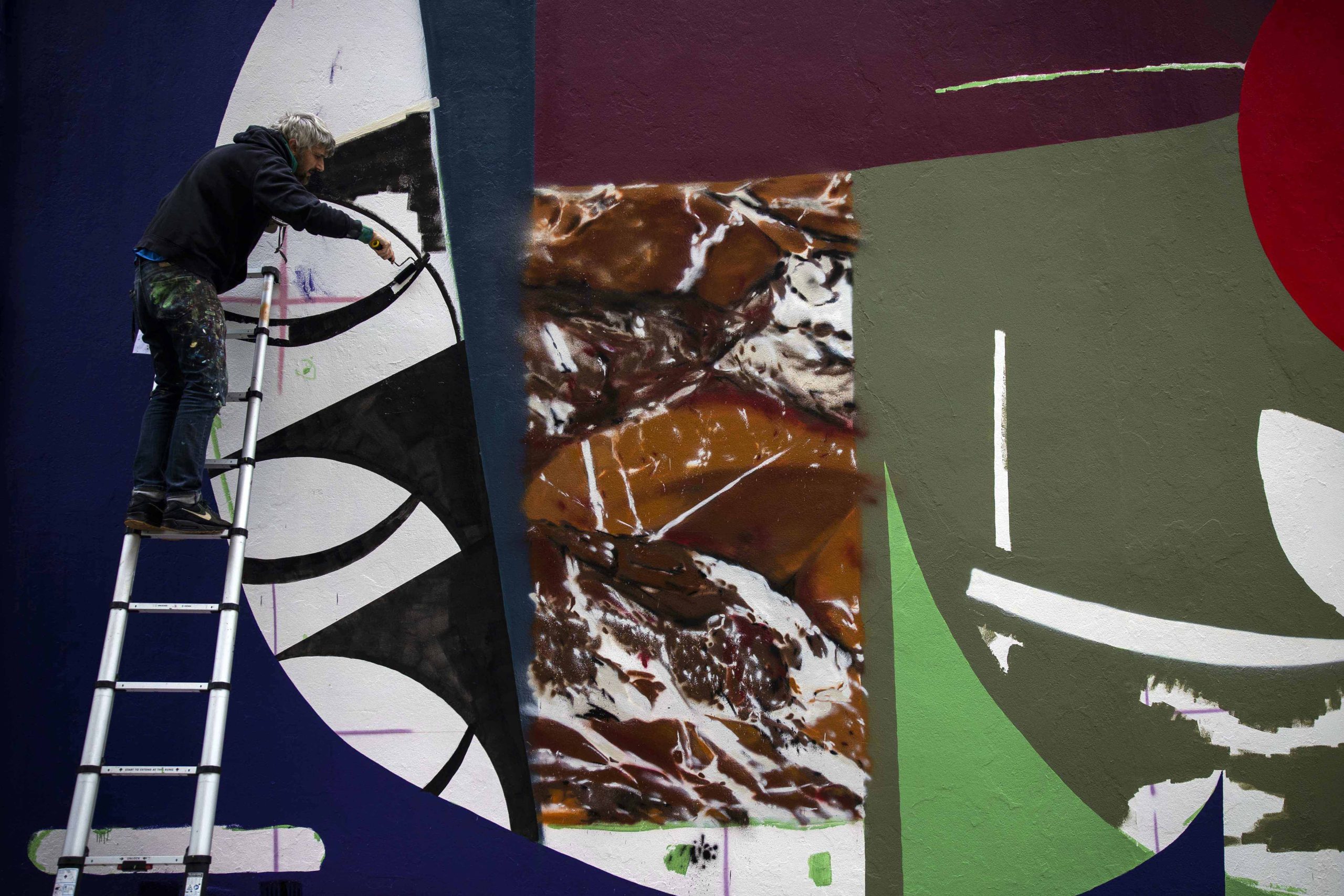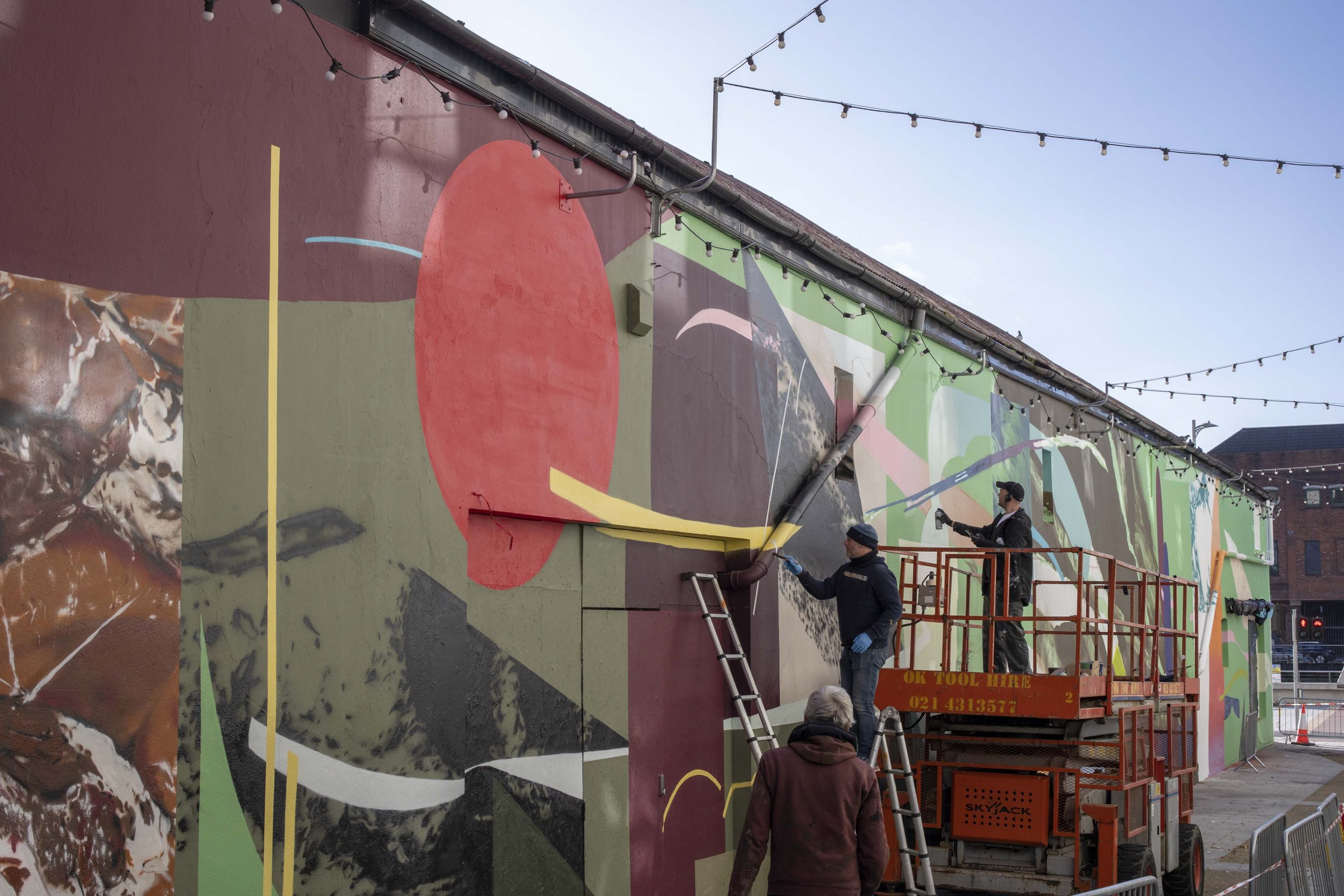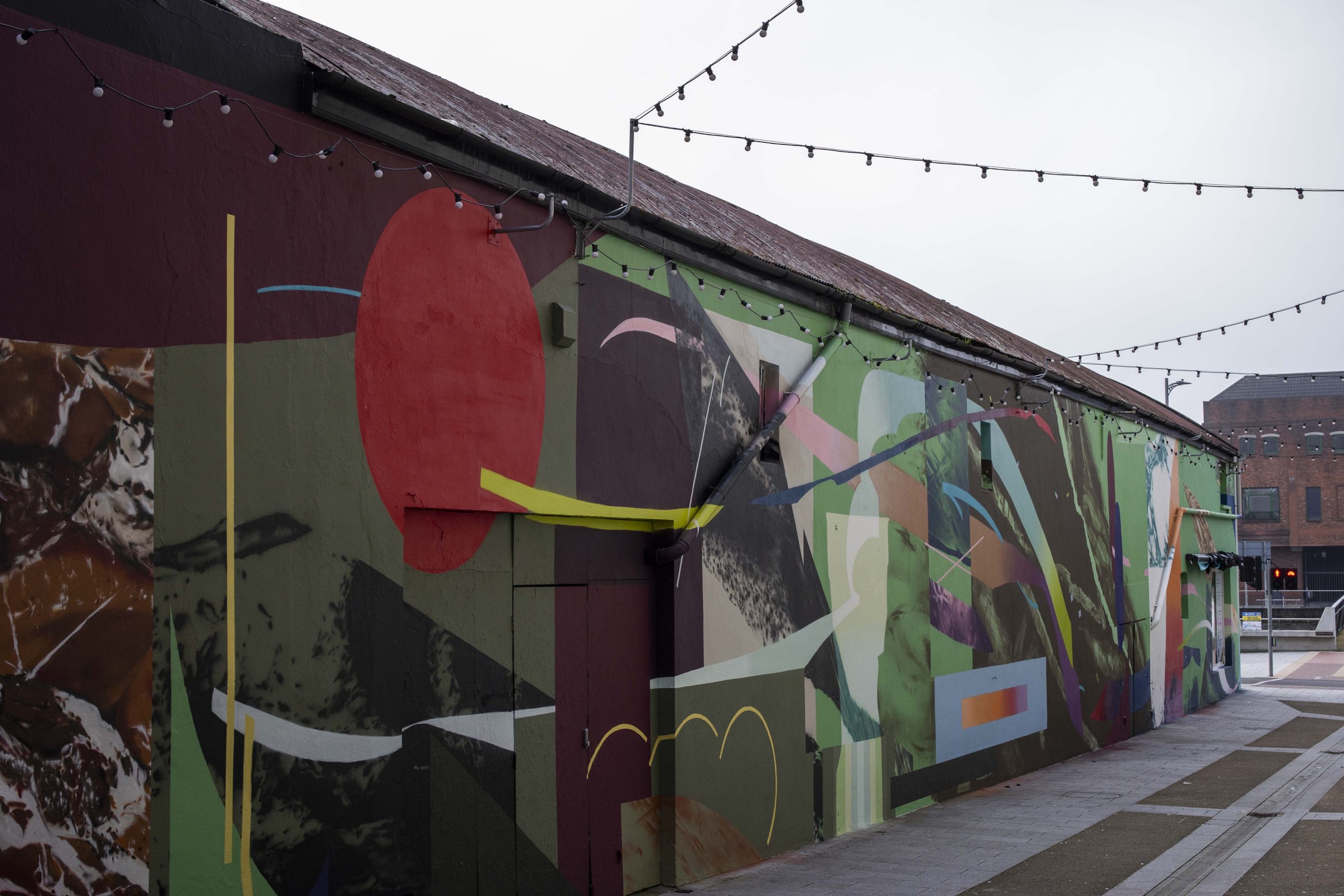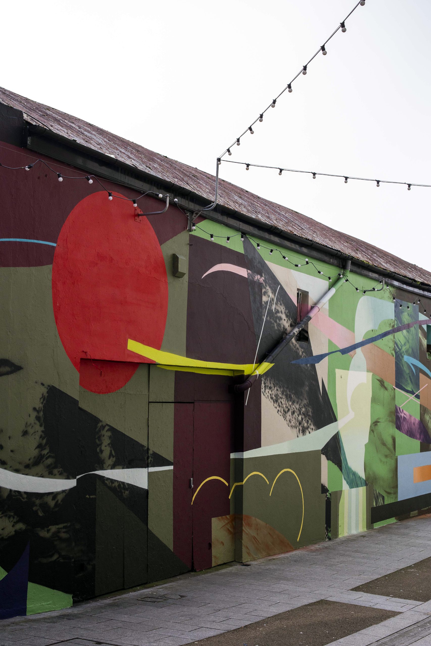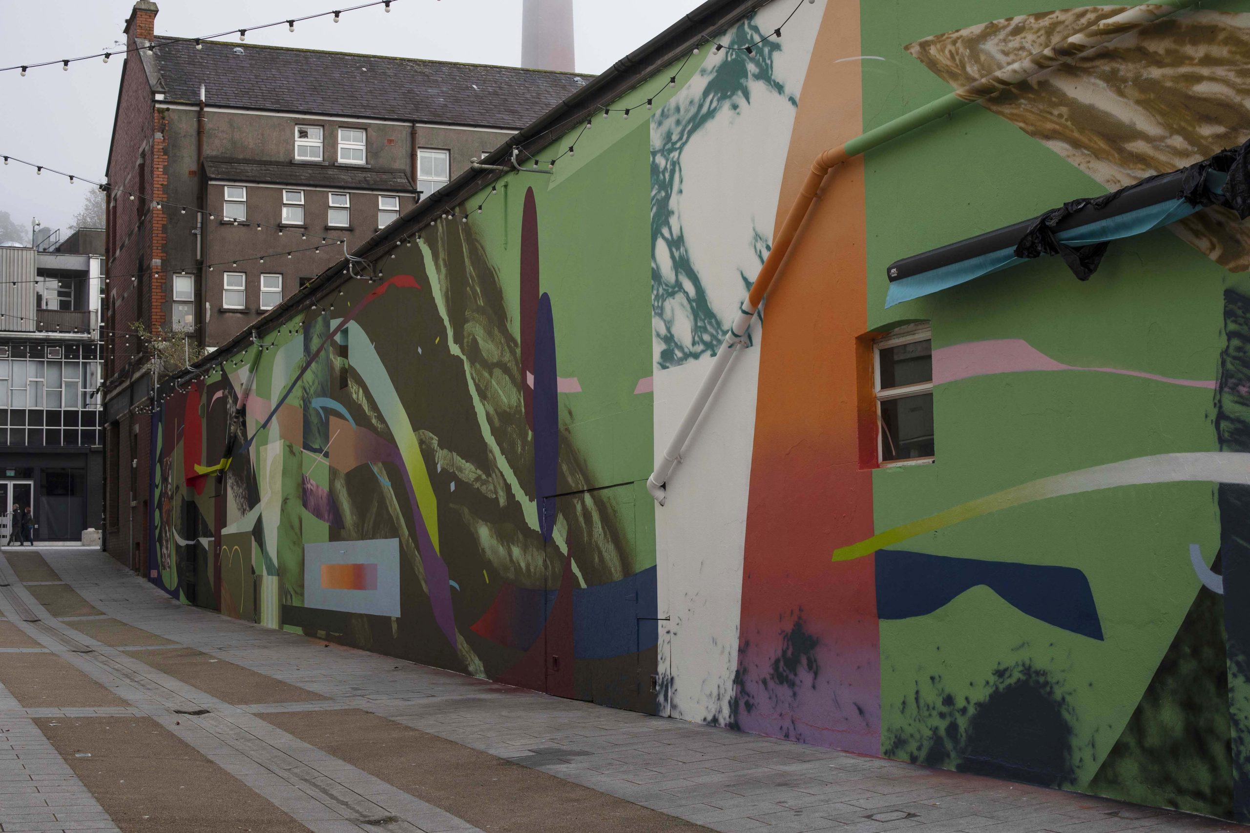 “When we first met to discuss potential ideas for this mural, we found that each of us had been exploring similar ideas, a positive sign from the get-go. We had a fruitful meeting wherein we discussed ideas of industry, geography, and the ever-changing facets of Cork as a city. Given its significant history as a thriving port city, we wanted to create a work that alludes to the River Lee, its movement and its importance to the trade of Cork, and Ireland as a whole. Utilising earthy tones offset by more vivid and vibrant colours we feel that the piece pays homage to the history of the county and its energy in moving forward as a city of cosmopolitan modernity. Hard-edged geometric shapes make reference to the urban elements of Cork City, in combination with more organic forms that suggest links to the sediment of the river and the more rural areas of the county. There are visual cues hidden within the composition, abstractions on the logos of Dunlop and Ford, for example, the water from the image on the county flag, alongside less oblique references such as the use of Cork marble in the piece, our aim was to create an exciting, stimulating mural that allows viewers to appreciate on a purely aesthetic level but also one that offers nuggets of reference and inspiration for those who wish to explore more deeply.”