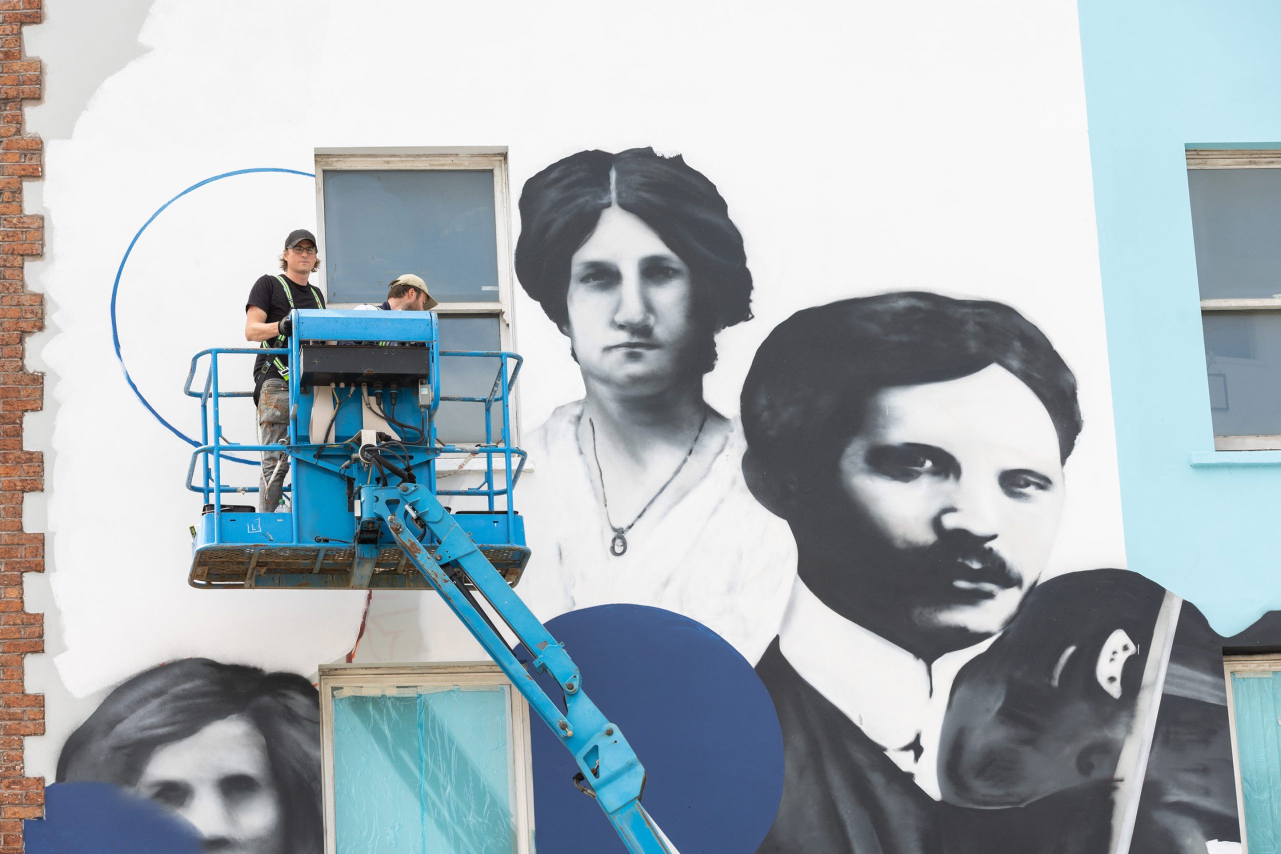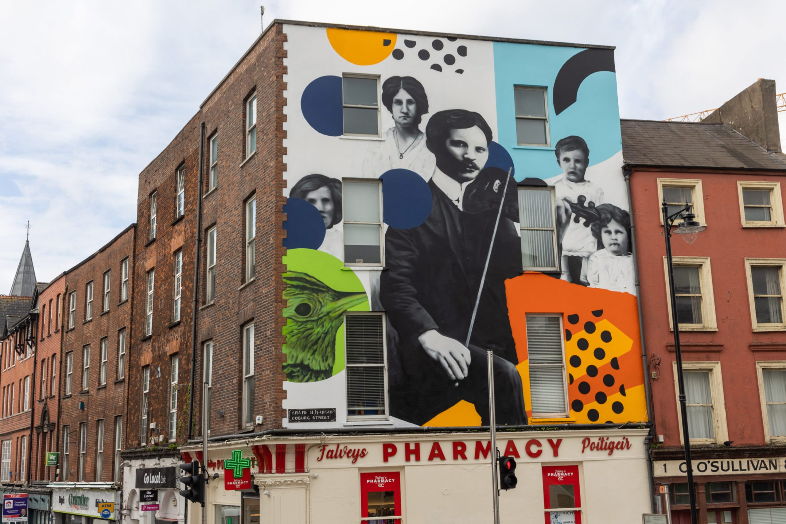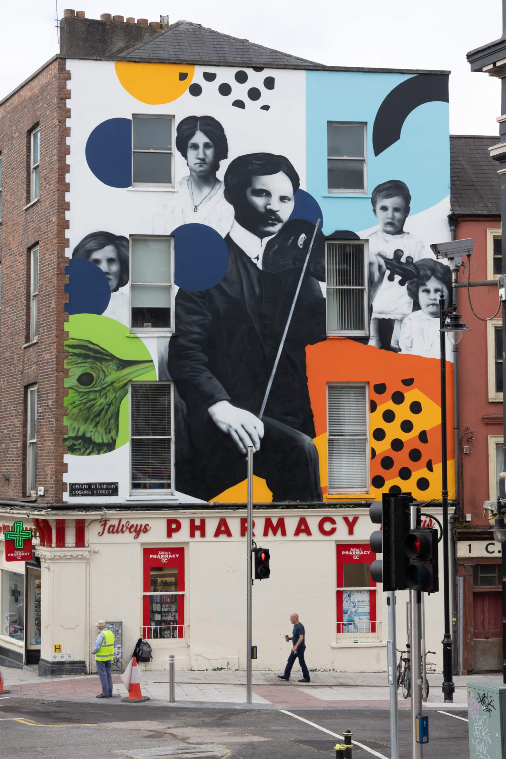 Their mural design commemorates Tomás MacCurtain. A man that contributed so much not only to the revolution in Ireland and Cork over 100 years ago, but also for his contribution to arts and culture in the city. It is the culmination of a project with Transition Year students from St. Angela’s and Christian Brothers College. The artwork explores MacCurtain as a musician and Celtic revivalist. It depicts MacCurtain with his fiddle and surrounded by his wife, Elisabeth, and 3 of their 5 children. The image of the Lark represents his favourite traditional song – ‘The Lark in the Clear Air’. While travelling the county as a recruiter for the Irish Volunteers, MacCurtain is known to have played this tune in many houses where traditional Irish musicians lived throughout Munster. MacCurtain is also known for setting up the volunteers pipe band in Cork City and this is also referenced in the ‘Air’ of the pipes. The Lark soaring through the clear air also evokes the idea of MacCurtain’s struggle for the freedom of his country and city.